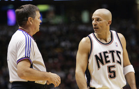 New Jersey Nets guard Jason Kidd (R) speaks to referee Bernie Fryer during a break in the action