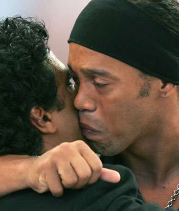 Brazilian soccer star Ronaldinho (R), who plays for Spanish club Barcelona, is greeted by his brother Roberto de Assis Moreira during the launch of the Ronaldinho institute for poor children in the southern Brazilian city of Porto Alegre December 27, 2006. [Reuters]