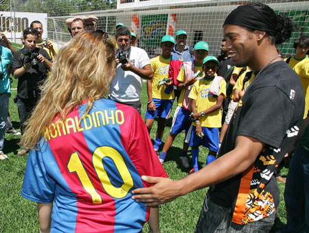 A girl wears a Ronaldinho T-shirt as she talks with Brazilian soccer star Ronaldinho (R), who plays for Spanish soccer team Barcelona, during the launch of the Ronaldinho institute for poor children in the southern Brazilian city of Porto Alegre December 27, 2006. [Reuters]