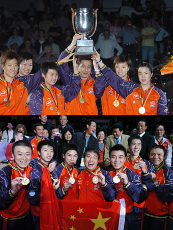China swept the men's and women's crowns in the world team table tennis championships held in Bremen, Germany, from April 24 to May 1. [Xinhua]