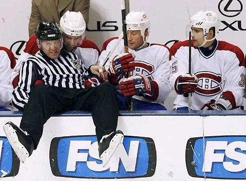 | NHL linesman Jean Morin struggles after falling into the