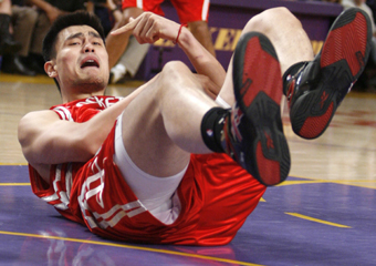 to block a shot and his knee got caught under Tim Thomas' body. Yao immediately