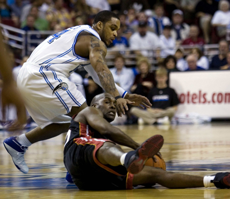 Orlando Magic guard Jameer Nelson (L) and Miami Heat guard Gary Payton go for