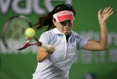 Zheng Jie of China plays a shot to Kim Clijsters of Belgium during