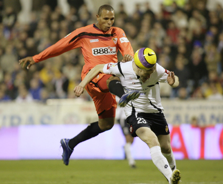 Real Zaragoza's Sergio Fernandez (R) fights for the ball against