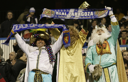 Real Zaragoza's supporters dressed as the Three Wise Men looks at the