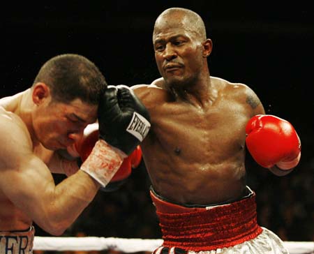 Travis Simms (R) connects with a right to Jose Antonio Rivera (L) during the 4th round of their WBA Super Welter Weight Boxing Championship at the Seminole Hard Rock Hotel and Casino in Hollywood, Florida January 6, 2007. [Reuters]