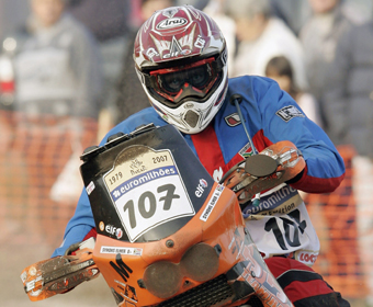 South Africa's motorcyclist Elmer Symons takes a curve on his KTM during the first special stage of the Lisbon Dakar rally in Grandola Southern Portugal January 6, 2007. Symons has been killed in a crash on the fourth day of the Dakar Rally in Morocco, organisers said on Tuesday. Picture taken January 6, 2007. [Reuters]