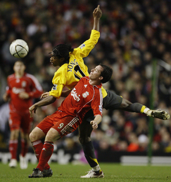 Liverpool's Robbie Fowler (R) challenges Arsenal's Alexandre Song for