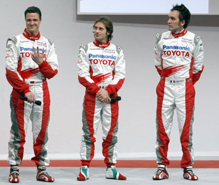 Toyota Formula One drivers Ralf Schumacher of Germany (L), Jarno Trulli (C) of Italy and Franck Montagny of France pose during the presentation of the new Toyota Formula One vehicle TF107 for the 2007 season in Cologne January 12, 2007. [Reuters]