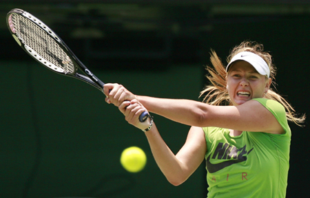 Russia's Maria Sharapova plays a shot during a training session at the