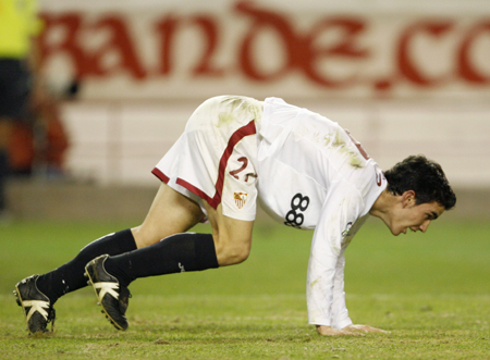 Sevilla's midfielder Alejandro Alfaro gets up during their Spanish King's Cup soccer match against Rayo Vallecano at Ramon Sanchez Pizjuan stadium in Seville January 17, 2007.[Reuters]