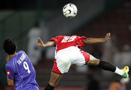 Kuwait's Fahad Al Rashidy (L) fights for the ball with Yemen's Ahmed Salim during at the 18th Arabian Gulf Cup soccer match in Abu Dhabi,January 17, 2007. [Reuters]