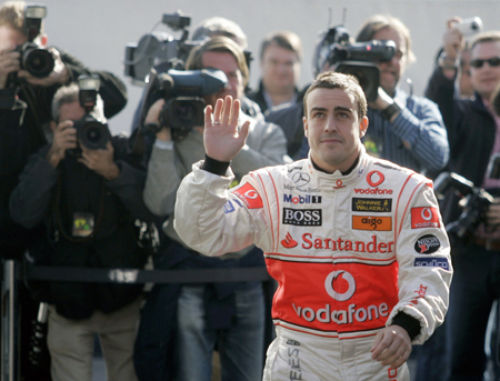 Formula One World Champion Fernando Alonso waves to his supporters