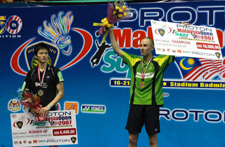 The veteran world number five threw his racket into the crowd in celebration at the climax of an amazing nine days that started with him being rushed to hospital after he suffered headaches and vomiting on his flight from Europe. "To win here under the difficult circumstances is just incredible," Gade-Christensen told reporters. "It's a very special feeling to win the first Super Series tournament, here in Kuala Lumpur, and it's something I will always remember. "Before I came here, I was in my best form ever but then I got sick and it was up in the air. But with the support of my coach and physio, I was able to play. "I got better and better as the tournament went on and to beat Bao in a tough final is very special." Gade-Christensen earned $16,000 for his victory while Bao took home $6,400. The Malaysian Open is the first leg of a 12-tournament Super Series tour which Badminton World Federation officials hope will boost the sport's appeal. After easily winning the first set, third-fourth seed Gade-Christensen loosened his grip on the match, allowing Bao to win points at will as the Chinese player levelled the scores. Bao rode the momentum into the third set, racing to a 6-2 lead, but the Dane showed great character to fight back to 6-6 before building a decisive 16-10 advantage. In the women's singles final, fifth-eighth seed Zhu Lin of China was too strong for local hope Wong Mew Choo, winning 21-15 21-12. There was further glory for China in the doubles events. In the mixed doubles final, Gao Ling and Zheng Bo beat England's Gail Emms and Nathan Robertson 21-12 14-21 21-15. Gao then teamed up with Huang Sui to win the women's doubles with a 19-21 21-12 21-11 victory over Indonesians Gresya Polii and Vita Marissa. Malaysian men's doubles pairing of Koo Kien Keat and Tan Boon Heong delighted the home fans in the capacity 3,000 crowd after they won the title with a 21-19 21-16 win in the final over the American-Indonesian duo of Tony Gunaway and Candra Wijaya. |