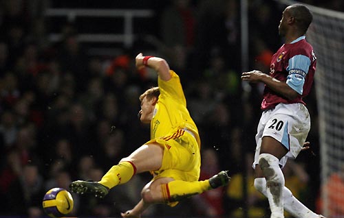 | West Ham United's Nigel Reo-Coker (R) challenges Liverpool's Jamie