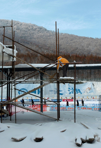 A Winter Asiad worker is clearing up the firn on the television broadcasting