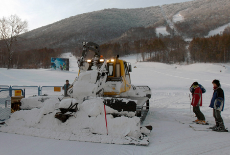 A Winter Asiad worker operates a forklift to shovel the snow at the
