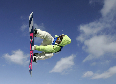 Japan's Murakami Daisuke soars through the air during the men's Snowboard/Halfpipe event at the Asian Winter Games in Jilin, northeastern China's Jilin province January 30, 2007.[Reuters]
