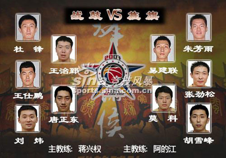 [Photo: sina.com] The lineups for the 2007 all-star game of the Chinese Basketball Association was announced on Wednesday. The head coaches for the two sides, Jiang Xingquan and Adijiang, selected 20 players out of 30 candidates for their squads with 10 for each. Center Wang Zhizhi from Bayi was the first choice for Jiang, who will direct the team named "War Drum," while Yi Jianlian was selected by Adijiang on the "Flag" team. Jiang also designated Min Lulei from Beijing Jinjyu as his assistant, while Adijiang chose Guo Shiqiang. The starting players of the two sides were also finalized with Yi Jianlian, Mo Ke, Zhu Fangyu, Hu Xuefeng and Zhang Jinsong playing for "Flag" and Wang Zhizhi, Tang Zhengdong, Du Feng, Liu Wei and Wang Shipeng for the "Drum." The 2007 CBA All-Star Weekend will be held in Yiwu, Zhejiang province from