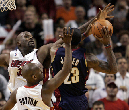 basket by the Miami Heat's Shaquille O'Neal (top L) and Gary Payton in the