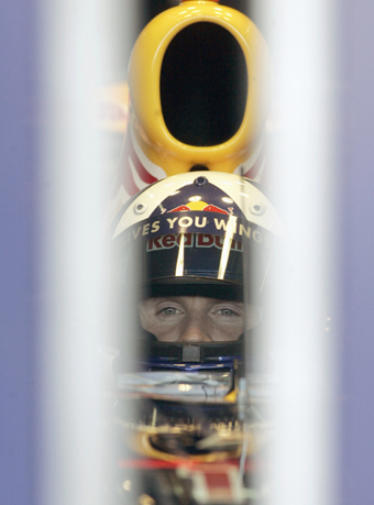 Red Bull's Formula One driver David Coulthard of Scotland sits in his car as seen through locked gates during a training session at the Ricardo Tormo race track near Valencia, February 1, 2007. REUTERS/Heino Kalis (SPAIN) |
