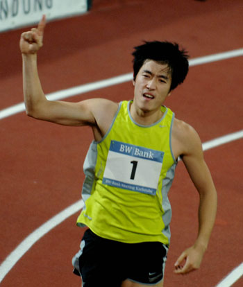 Liu Xiang of China celebrates after winning the 60 meters hurdles competition