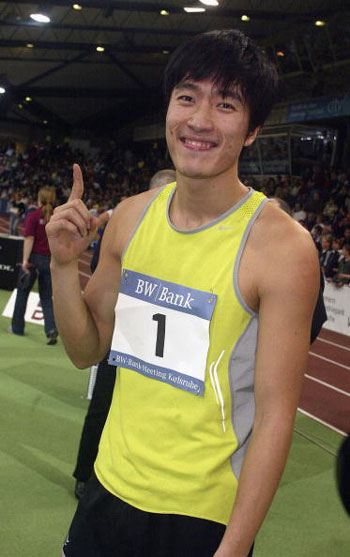 Liu Xiang of China celebrates after winning the 60 meters hurdles competition