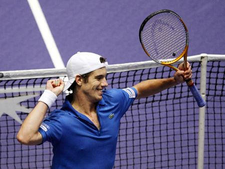 Richard Gasquet of France celebrates after defeating Andrei Pavel of Romania to qualify France during their World group first round Davis Cup tennis match in Clermont-Ferrand, central France, February 11, 2007. [Reuters]