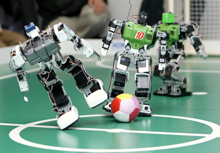 Humanoid robots fight for the ball during a soccer tournament in Tokyo February 12, 2007. [Reuters]