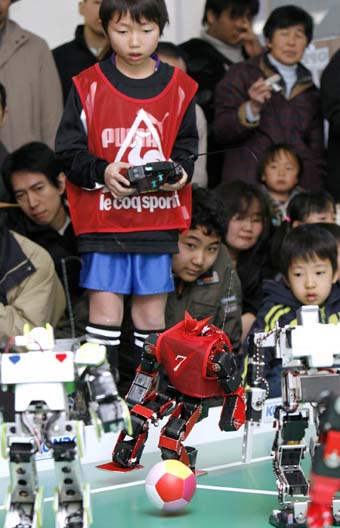 A boy controls a humanoid robot during a soccer tournament in Tokyo February 12, 2007. [Reuters]