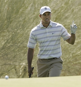 Woods went from the desert to the fairway and made a 20-foot par putt to halve the hole, setting the tone for a 3-and-2 victory over Ryder Cup teammate J.J. Henry in the first round of the Accenture Match Play Championship. One match down, five to go if the world's No. 1 player wants to stretch his PGA Tour winning streak to eight. After one round at The Gallery, it figures to be a wild ride. For the second straight year, the shortest day belonged to Stephen Ames. He was on the losing end of a record rout by Woods last year at La Costa, but experienced the flip side of this fickle tournament by making seven birdies in 11 holes to bury Robert Karlsson of Sweden, 8 and 7. Seven matches went the distance, including fourth-seeded Phil Mickelson holding off fellow lefty Richard Green of Australia. Four matches went overtime, none more shocking than No. 3 seed Adam Scott making a birdie on the 18th hole to extend his match, only to three-putt the 21st hole to lose to Shaun Micheel. Jim Furyk, the No. 2 seed, was trailing at the turn until he ran off three straight birdies and outlasted Brett Quigley, 2 and 1. And while the Match Play left soggy San Diego for the high desert north of Tucson, that didn't help Ernie Els. For the fifth time, the Big Easy was ousted in the first round, making only one birdie in his 4-and-3 loss to Bradley Dredge. Thomas Bjorn of Denmark summed it up for 31 other guys headed for the airport after losing, 6 and 5, to Trevor Immelman. "Disappointed to come all the way for that," he said. Woods was 5 under in the 16 holes he played, making only one bogey. But it was a tougher day than the result showed. "It was actually a pretty tight match," Woods said. "J.J. hit a lot of beautiful putts in the middle part of the round and even on the back nine, and those putts just didn't go in. Had they gone in it might have been a different story." Woods advanced to face Tim Clark of South Africa, a 3-and-2 winner over Robert Allenby. Some feel this might be the toughest hurdle in Woods' unlikely quest to win
