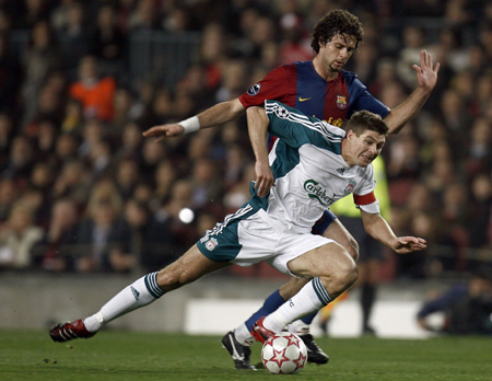 Liverpool's Steven Gerrard (R) is tackled by Barcelona's Thiago Motta during