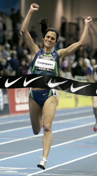 Shayne Culpepper raises her arms as she crosses the finish line to win