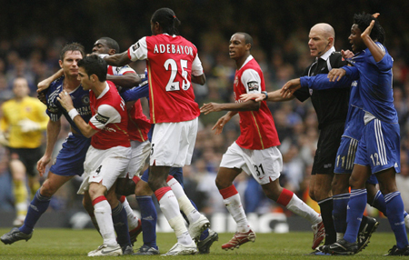 Chelsea and Arsenal players scuffle during the League Cup final soccer