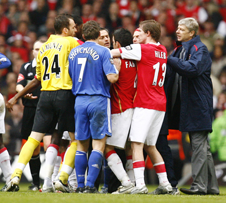 L) and Arsene Wenger (R) calm a scuffle during the League Cup final soccer