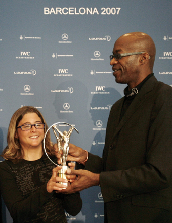 Laureus Academy Chairman Edwin Moses (R) and Spanish-nominated Gisela