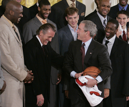 U.S. President George W. Bush (2nd R) shares a laugh with Miami Heat's