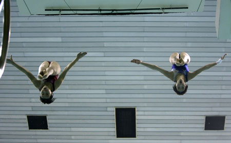 Chinese divers Jia Tong (L) and Chen Ruolin train with the national team in Jinan of east China February 28, 2007. The team has announced the roster for the coming World Swimming Championships in March in Melbourne of Canada. [Xinhua]