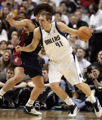 Dirk Nowitzki scored 24 points and had 11 rebounds as Dallas (49-9) matched the mark they set in 2002. Cleveland, behind LeBron James's 39 points, trimmed a 12-point Dallas lead to three in the final quarter, but the Cavaliers were unable to get any closer as James missed two free throws and two three-point attempts in the final 13 seconds. "He was great all night, so I thought one of them for sure was going in," Nowitzki told reporters after the game. "We dodged a bullet there, obviously." Dallas, which had five players in double figures, never trailed after taking a 25-23 lead with a minute remaining in the first quarter, but Cleveland and James made it interesting. After Jason Terry's three-pointer gave Dallas an 87-75 advantage with 6:52 left in the game, the Cavaliers outscored the Mavericks 17-8. James had 11 of those points, but suddenly went cold in the closing seconds. He missed two free throws with 13 seconds to go and the score 95-92, then misfired on a pair of long-range attempts at four seconds and just before the buzzer. "Same two looks that I got the last game against the Hornets, and I was able to bury them," James told reporters. "They were some good looks. I thought both of them were going down. I'll take that shot any day." James made 17-of-24 shots from the floor. Donyell Marshall added 14 points and Aleksandar Pavlovic scored 11 for Cleveland. Terry followed Nowitzki with 20 for Dallas. Josh Howard added 17 and Jerry Stackhouse and Erick Dampier scored 10 each. *Rashard Lewis scored 31 points as the Seattle SuperSonics edged the Los Angeles Clippers 77-75 at home. Ray Allen, Seattle's leading scorer, missed the game with an ankle injury, the team said. *The Portland Trail Blazers held the Charlotte Bobcats to 16 points in the first quarter and roared to a 127-90 home victory. Lamarcus Aldridge scored 30 points and Zack Randolph and Martell Webster had 20 each for Portland. |
