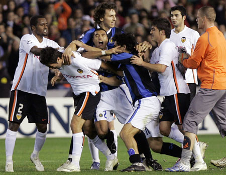 Luis Figo and Inter's Esteban Cambiasso were involved in scuffles as they tried