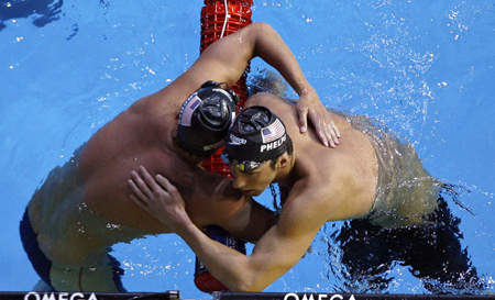 Michael Phelps of the U.S. and second-placed compatriot Ryan Lochte