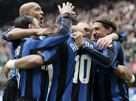 Inter Milan's Hernan Crespo (R) celebrates with his team mates after