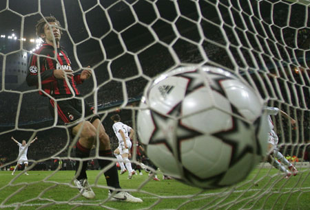 Bayern Munich's Daniel Van Buyten (No5) scores the first equalizing goal against AC Milan during their UEFA Champions League quarter-final soccer match in Milan, April 3, 2007. The match ended in a 2-2 draw and Van Buyten scored twice.[Reuters]