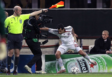 Bayern Munich's Hasan Salihamidzic pushes away a steadycam operator during his Champions League first leg quarter-final match against AC Milan at San Siro stadium in Milan April 3, 2007. [Reuters]