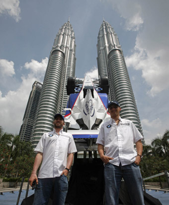 Kubica of Poland, pose during a photo call in front of Malaysia's landmark