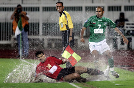 Al-Rayyan's Muhammed Ismaiel (L) of Qatar fights for the ball with Khaled Zadah of Al-Arabi for Kuwait during their AFC Champions League 2007 soccer match in Kuwait April 11,2007.[Reuters]