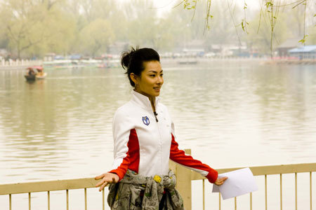 China's Olympic gymnastics champion Liu Xuan shoots a new Beijing Olympic promotion advertisement in Beijing's Shi Chahai Park, a well-known touring site for its Beijing traditional flavor. [newsphoto]