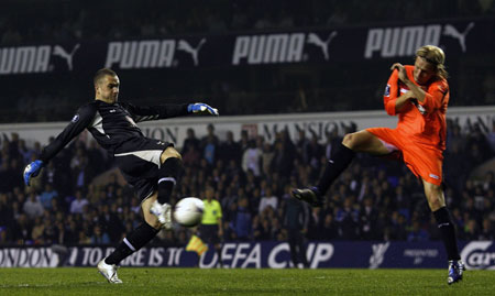 Tottenham Hotspur's goalkeeper Paul Robinson (L) has a shot on goal blocked by Sevilla's Christian Poulsen during their UEFA Cup quarter-final, second leg soccer match at White Hart Lane in London April 12, 2007.[Reuters]