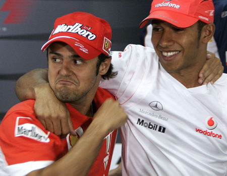 Ferrari's Formula One driver Felipe Massa (L) of Brazil and McLaren's
